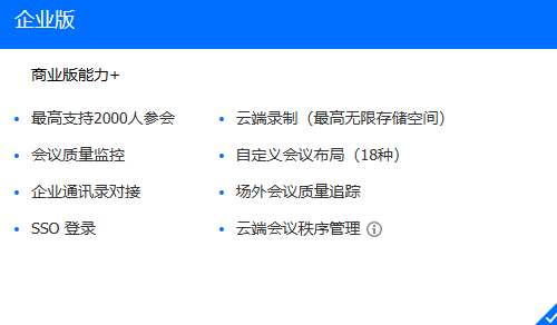 如图所示,企业版则是在商业版所有权限的基础上,外加了更多的权限,如无限制的存储空间、会议质量把控、场外会议质量追踪等等,同理,企业版也是作为商业化的工具,更适合一个公司来用。