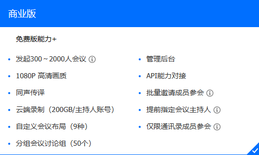 如图所示,商业版可以提供在免费版能力的基础上的额外的300~2000人会议、1080高清画质、同声传译、云端录制200G/主持人账号、自定义布局、分组会议讨论、后台管理、API能力对接、批量邀请、主持人指定、会议权限。可以明显看出,充值商业版更加适合商业化来使用。