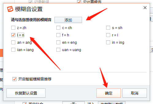 3、在这里勾选自己想要的模糊音效果,比如有些地区拼音【l】和【n】不分,就可以勾选,如果图中没有的话可以点击【添加】来设置,设置好后点击【确定】,保存即可;