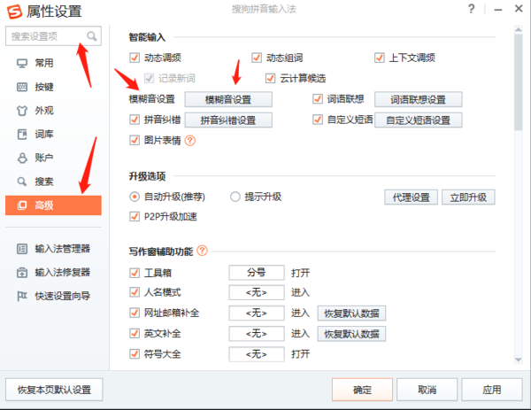 2、弹出属性设置的窗口后,大家可以在左上角搜索框中输入【模糊音】,或者在左侧栏的【高级】中查找,找到后勾选开启模糊音并点击【模糊音设置】;