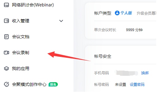 3、随后,在弹出的【个人中心】窗口中,找到左侧分栏的【会议录制】;