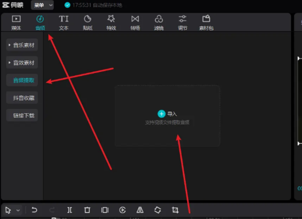 2、进入创作界面,在左上角中,点击【音频】,在下方分栏中找到并点击【音频提取】;