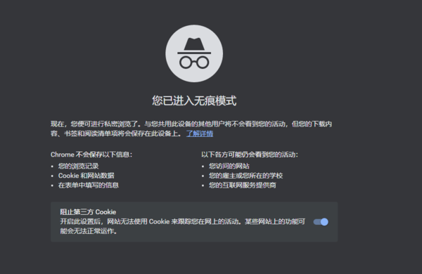 之后,会弹出一个新的独立的页面,在这个独立的无痕模式下,我们的浏览器记录Cookie?和网站数据以及在表单中填写的信息等都不会被记录,但需要注意的是,我们的有些活动可能仍会被第三方监控到,比如访问的网站、雇主、所在学校、互联网服务提供商等。