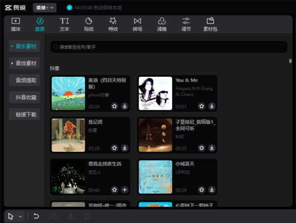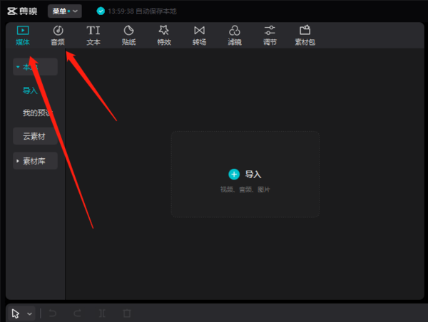 2、之后,打开剪映,将素材导入,或者找到左上角的【音频】,找一个软件自带的音频素材,之后将素材拖拽至音轨中;