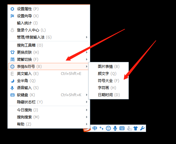 我们将搜狗输入法切换出来,右键单击搜狗输入法窗口,找到【表情/符号】选项,在其中找到【符号大全】;