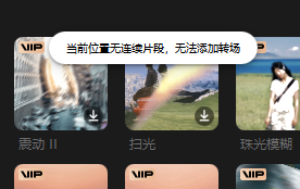 4、如果素材并不是连贯的,是无法添加的,会提示我们【当前位置无连续片段,无法添加转场】,这也是为什么我们要开启【主轨磁吸】来确保素材连贯的原因;