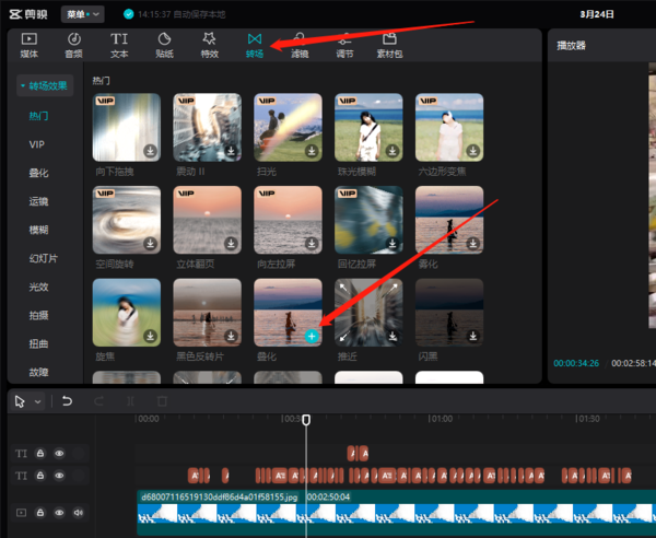 3、点击左上角的框中上方的【转场】一览,在这里有非常多的转场效果可以选择,我们可以下载预览一下,点击【+】号即可添加转场效果;