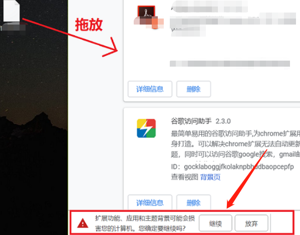 2、之后,我们将插件拖放至扩展程序,随后会提示安全提醒窗口,询问我们是否继续,点击【继续】,之后的步骤就和第一种方法一样了。