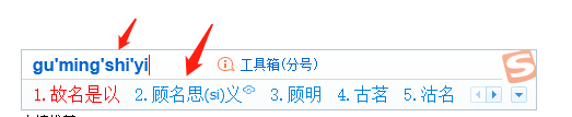 如图,小编想要输入【顾名思义】这个词语,但是拼音将【si】打成了【shi】,但是搜狗输入法可以智能识别,并且给出我们可能想要的正确汉字。