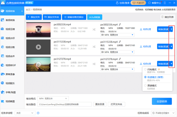 (3)转换模式?点击“转换”按钮右侧的下拉按钮,可以设置视频文件的转换模式。