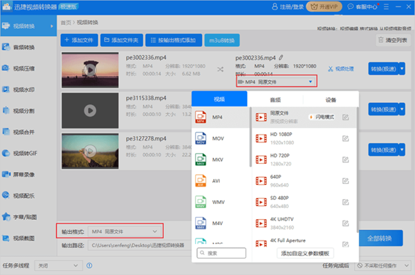 (2)设置参数?单个文件:点击每个文件的“格式选项”即可设置视频想要转换的格式、尺寸等参数。?多个文件:点击下方的“输出格式”,一次性设置全部文件的转换参数。