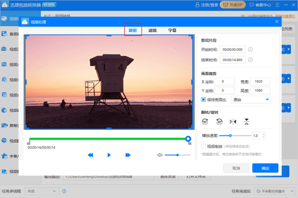 通过拖动调整剪切片段或者手动设置剪切片段的时间点,可以对视频进行剪切、截取。同时,还可以对视频画面的进行尺寸裁剪,并且支持画面翻转、旋转,视频倒放等功能。