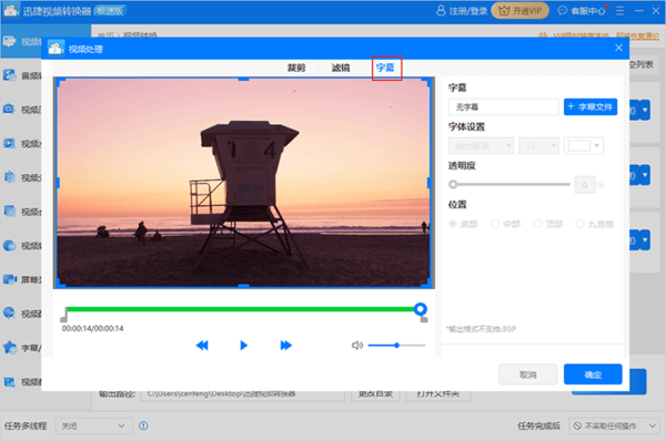 点击切换到“字幕文件”功能,可以导入字幕文件来为视频添加字幕。并且支持设置字幕的字体、透明度和字幕位置。完成视频处理之后,点击“确定”即可保存操作。