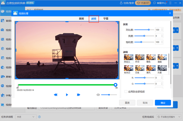 点击切换到“视频编辑”功能,可以调整视频的“音量”、“播放速度”,并且可以通过“滤镜”、“效果”来调整视频画面的色调效果。