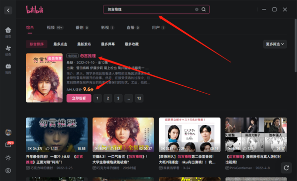 我们打开哔哩哔哩,直接在主页面上方搜索【勿言推理】即可在线点播。