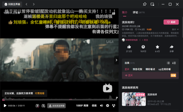 就在前几天,哔哩哔哩官方正式发布公告,已经引进了《流浪地球2》官方正版资源,大家可以在哔哩哔哩中观看此影片,哔哩哔哩配备的超清画质、弹幕讨论、相关剪辑视频等等,肯定能满足大家的胃口。