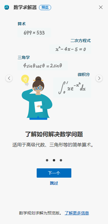 ①进入到Edge浏览器的数学求解器界面当中,然后点击两次【下一个】按钮。
