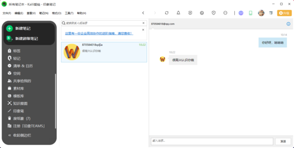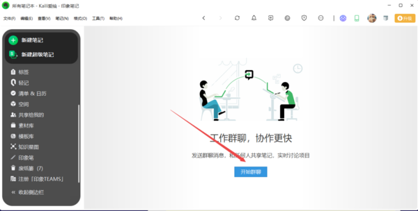 根据查找到的资料以及小编的亲自使用经验来看,可以聊天的云笔记软件是印象笔记,该软件是目前超多小伙伴都在使用的一款云笔记工具,同时软件还具备工作群聊的功能,使得日常群聊沟通更加的便利。
