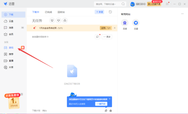 第一步,启动电脑端的迅雷,找到左侧列表中的【游戏】选项,并点击进入。