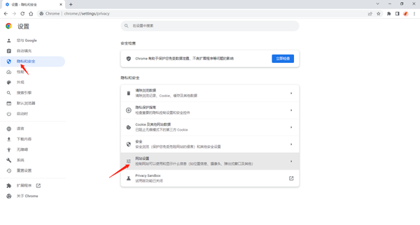 2、进入到【设置】页面后,点击左侧【隐私和安全】,在页面中选择【网站设置】。
