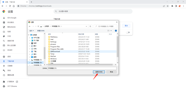 2、谷歌浏览器默认下载路径在C盘,我们找到想要的安装路径,点击【选择文件夹】即可。