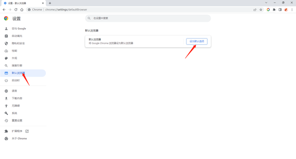 1、在谷歌浏览器【设置】界面,点击左侧【默认浏览器】,点击【设为默认选项】。