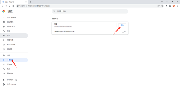 1、在谷歌浏览器【设置】界面,点击左侧【下载内容】,点击【更改】。