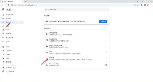 1、在【隐私和安全】界面中,点击【网站设置】。