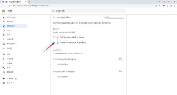 3、勾选【不允许网站显示弹出式窗口或使用重定向】即可。
