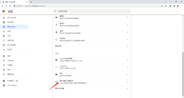 2、找到【内容】,点击【弹出式窗口和重定向】。