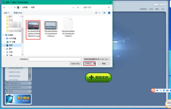 第三步,然后系统会弹出选择文件的窗口,此时我们找到所需要进行转换的视频,然后点击选择它,接着在点击【打开】按钮。