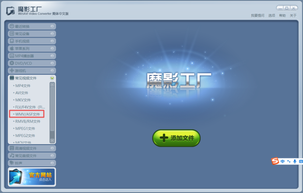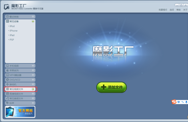 第一步,在电脑上找到魔影工厂软件然后点击打开,进入到软件的主界面当中后,找到界面左侧的【常见视频文件】选项,并点击它。