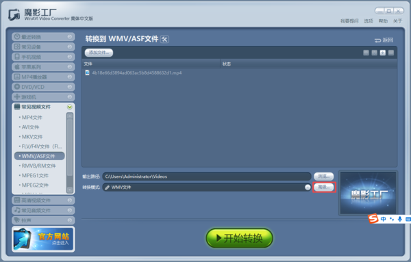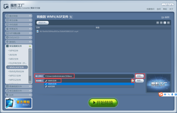 第四步,回到软件的主界面当中后,在界面的底部,我们可以看到【输出路径】选项,这个是视频转换后的文件的存储路径,如果需要更改的话,可以点击【浏览】按钮来进行路径的更改。而在输出路径的下方有一个【转换模式】选项,这里我们点击其右侧的下拉按钮,我们便可以选择视频转换后的格式是WMV的还是ASF的了。