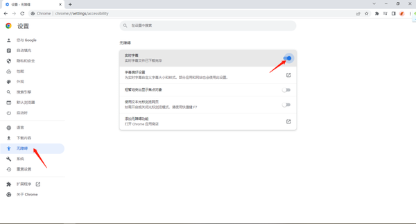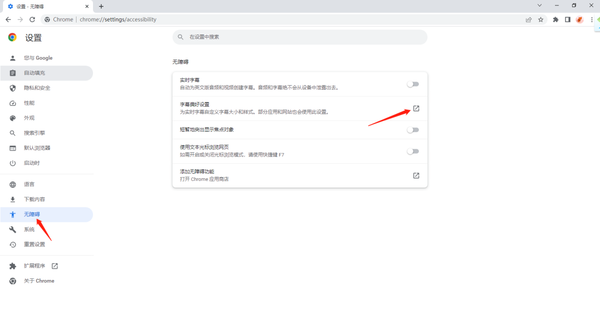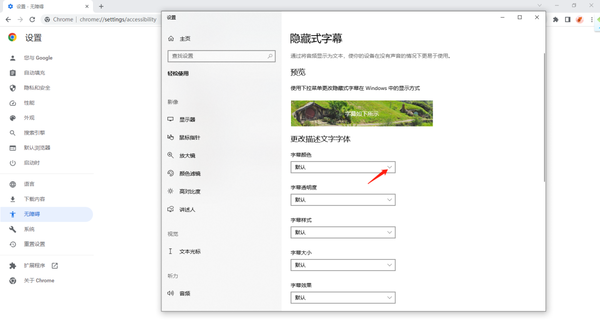 1、打开谷歌浏览器,在【设置】中进入【无障碍】界面,点击【字幕偏好设置】右边的小倒立三角符进入。