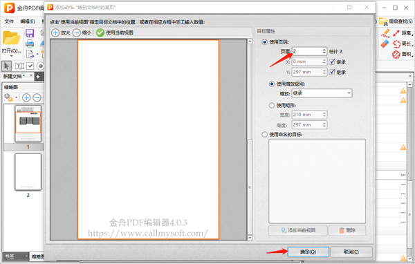 4、以转到文档中的某页为例,在弹出框中选择跳转页面,点击【确定】后进行保存。当鼠标按下该单元格时会跳转到第二页。