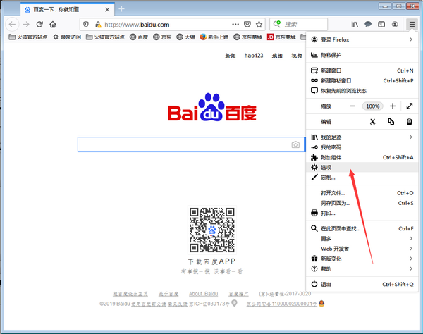 1、第一步,在电脑上运行火狐浏览器,找到右上角的三条横线标志,点击之后在弹出的菜单中点击“选项”功能。