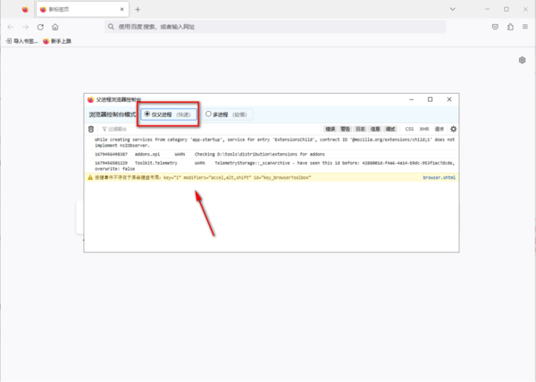 4、这时候就进入到了控制台的界面了,在这个界面你可以点击【仅父进程】按钮,就会看到一些相关的代码显示。