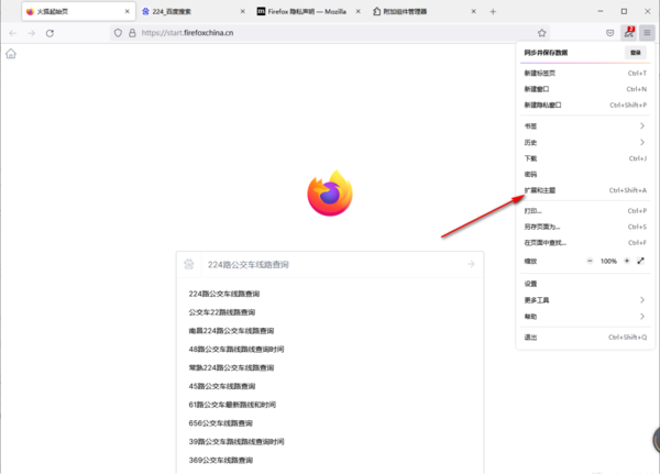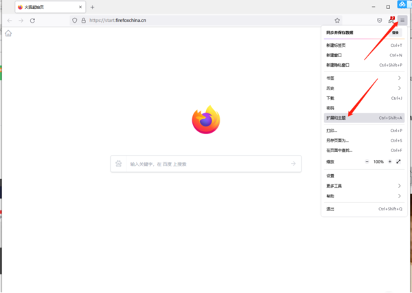 1、首先我们需要在电脑上打开火狐浏览器,进入到主页之后点击右上角的三条横线标志,然后就会出现一个菜单选项,在菜单里找到【扩展和主题】,如图所示。