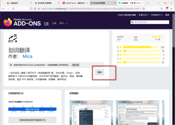4、将这个翻译插件安装以后,就会呈现出下图的内容,因为小编是之前安过这个插件,所以现在显示的是“移除”。