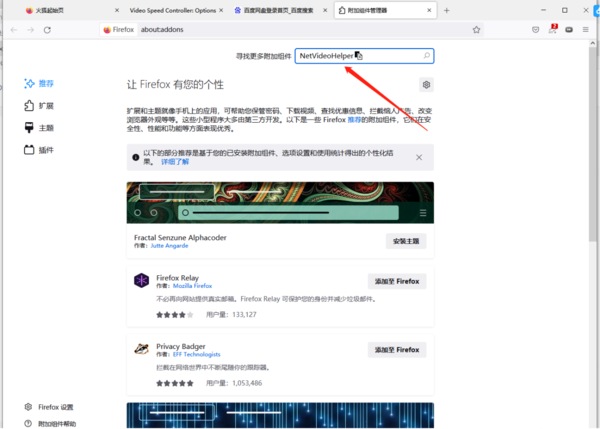 2,、进入到扩展与主题页面之后,在搜索框中输入【NetVideoHelper】,点击搜索。