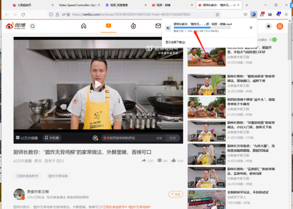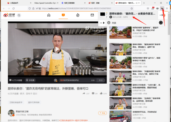6、添加完插件以后,我们将想要缓存的视频打开,然后点击右上角的插件图标,就可以在打开的窗口中看到下载的视频列表了,点击之后就开始下载了,等待即可。