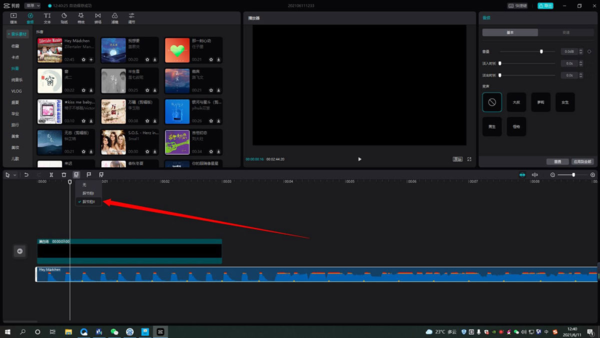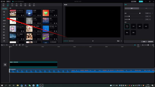 2、然后我们选择音频功能,添加剪映自带的音频音乐。