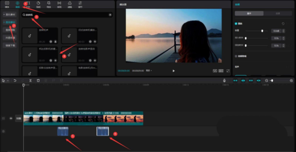 第三步,接下来选择音频选项,点击音频素材按钮,在搜索栏中输入放映机,选择一段音效作为素材,并将其分别添加到三秒和6秒处。