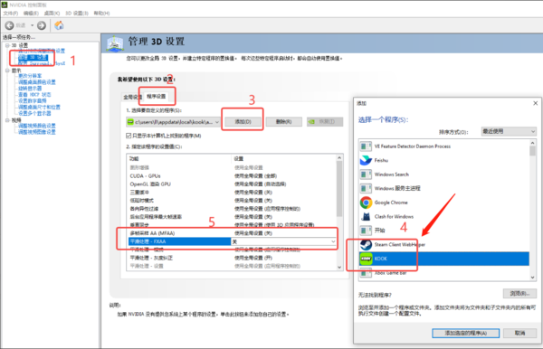 2、随后,在【管理3D设置】中,依次选择点击【程序设置】----【添加】----【KOOK】----【平滑处理】,在这里将其关闭,右上角应用修改,保存即可。