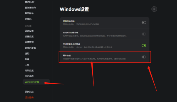我们进入KOOK的设置中心,在【Windows设置】中找到【硬件加速】,将其关闭后重试即可。