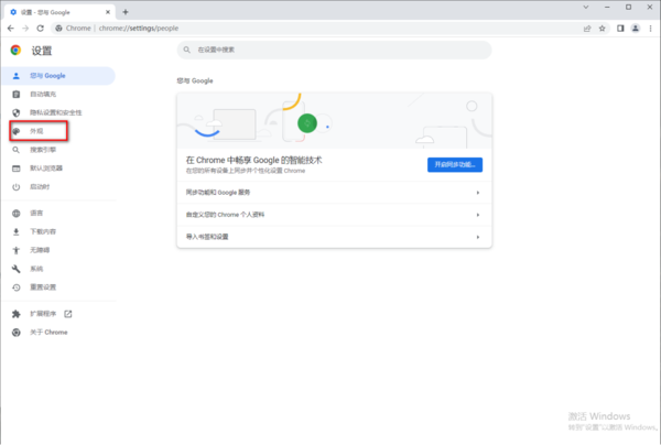 3、如下图所示,在设置页面左侧的功能栏中,点击“外观”这个选项,进入到外观的设置页面。