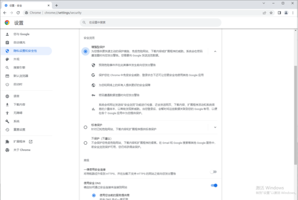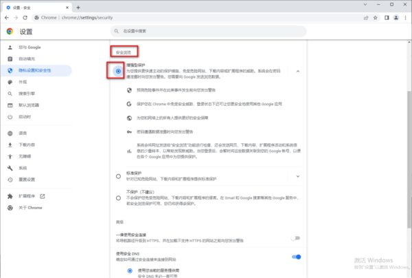 5、在“安全”设置页面一般我们设置的都是“标准保护”,如果你需要强度更高的保护,建议勾选上“增强型保护”,这样就不用担心你上网的信息被侵犯了。