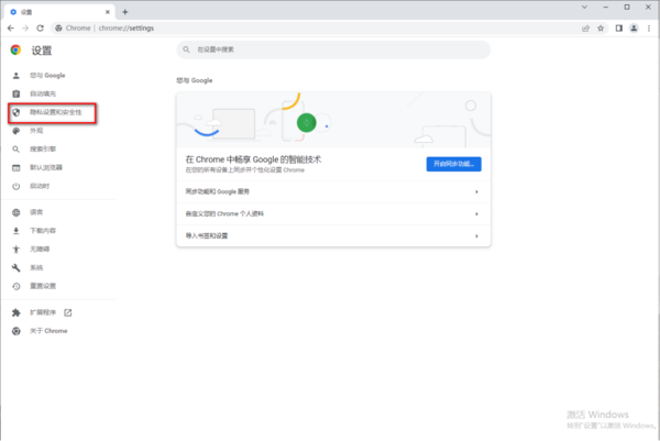 3、进入到设置页面以后,找到左侧功能栏里的【隐私设置和安全性】进行单击打开。