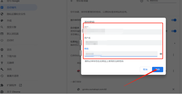第四步,将想要添加的网址以及密码添加到弹出的窗口中,点击保存即可。