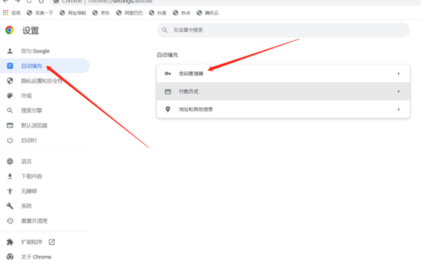 第二步,进入到设置页面之后,左侧的功能栏里点击第二个自动填充,然后右侧就会出现自动填充的内容,此时选择密码管理器。